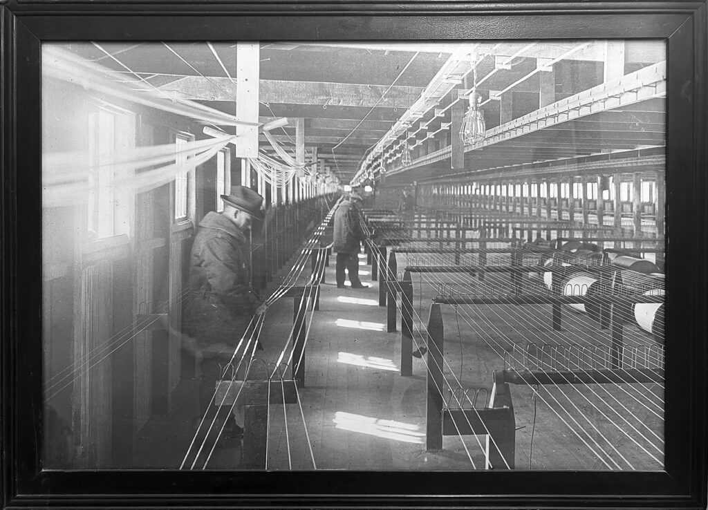 Produção em linha de montagem de linhas de pesca torcidas para uso comercial, por volta de 1900